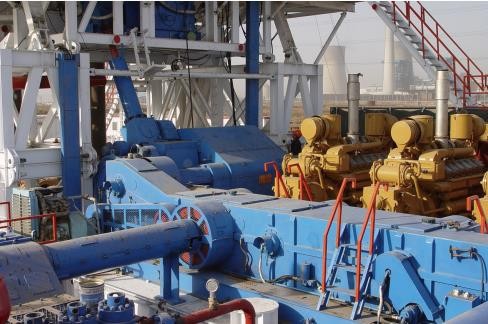 ◆ 机械钻机是柴油机驱动用链条箱并车后驱动绞车和泥浆泵,通过爬台万向轴驱动转盘链条箱带动转盘。