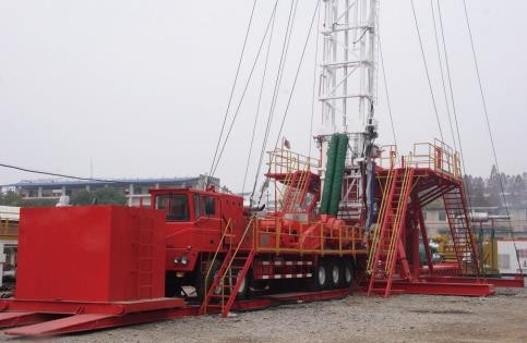 无绷绳/自绷绳修井机:修井机放置在自走式底盘车上,双节伸缩式井架,用液缸起升,井架绷绳固定在主机车上或单独底座延伸件上,不用固定地锚,大大提高了安装/拆卸时间,提高效率。